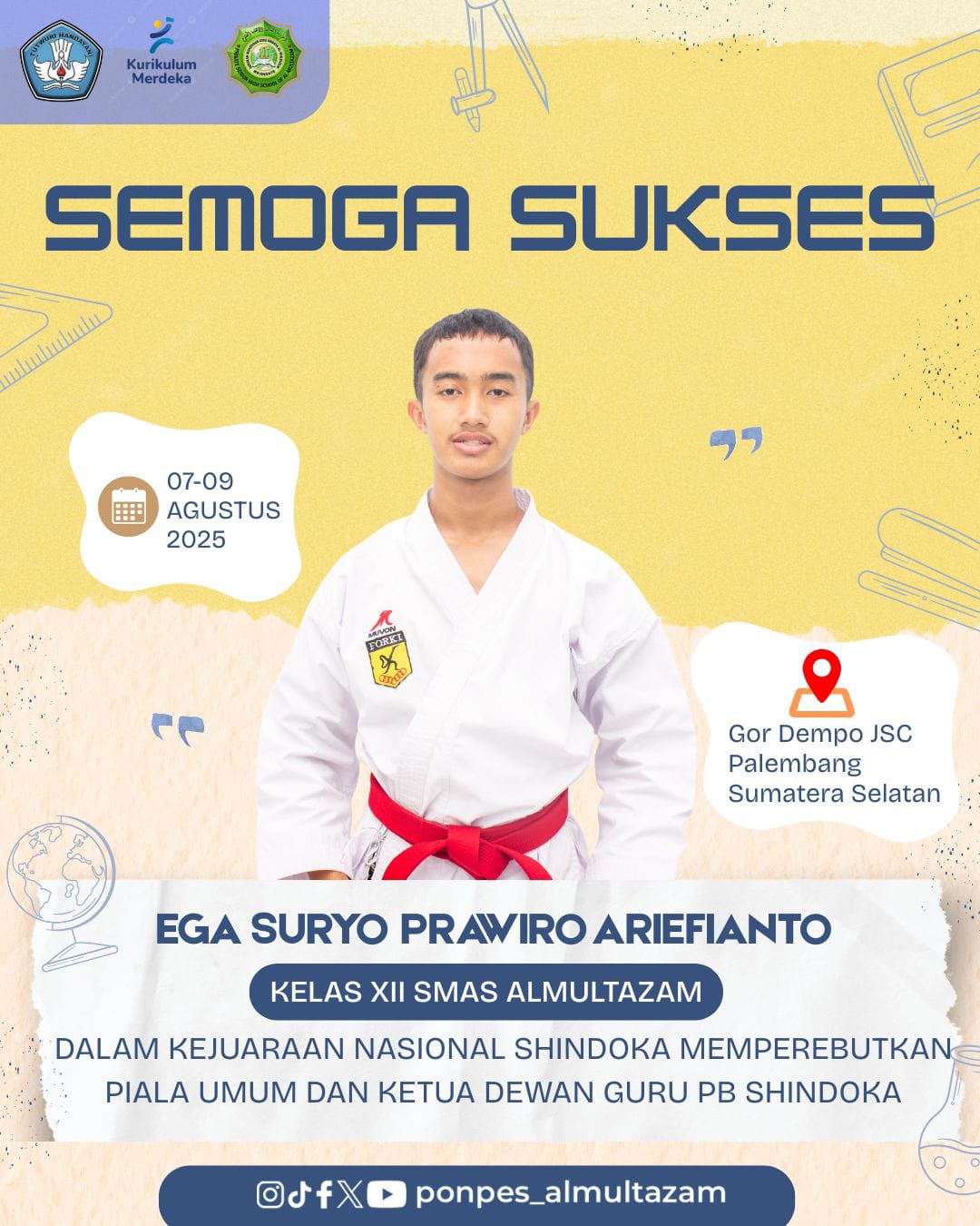Selamat dan sukses kepada Ega Suryo Prawiro A., peserta didik kelas XII-C SMAS AlMultazam yang tergabung di tim Provinsi Jawa Timur dalam Kejuaraan Nasional SHINDOKA memperebutkan piala umum dan Ketua Dewan Guru PB SHINDOKA.