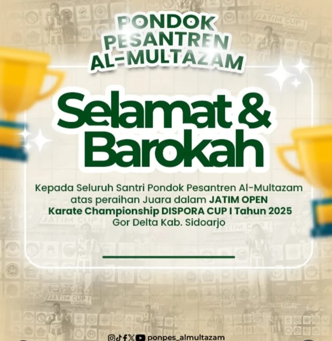 Peringatan Maulid Nabi Muhammad SAW akan dilaksanakan pada Senin depan, 08 September 2025 di masjid PP. AlMultazam 1. Agenda ini akan diikuti oleh seluruh siswi dan dewan asatid wal ustadzat SMAS AlMultazam. Kegiatan yang dilaksanakan adalah pembacaan diba'iyah, sambutan kepala sekolah dan mauidhoh hasanah dari Pengasuh PP. AlMultazam KH. Makinuddin Qomari.